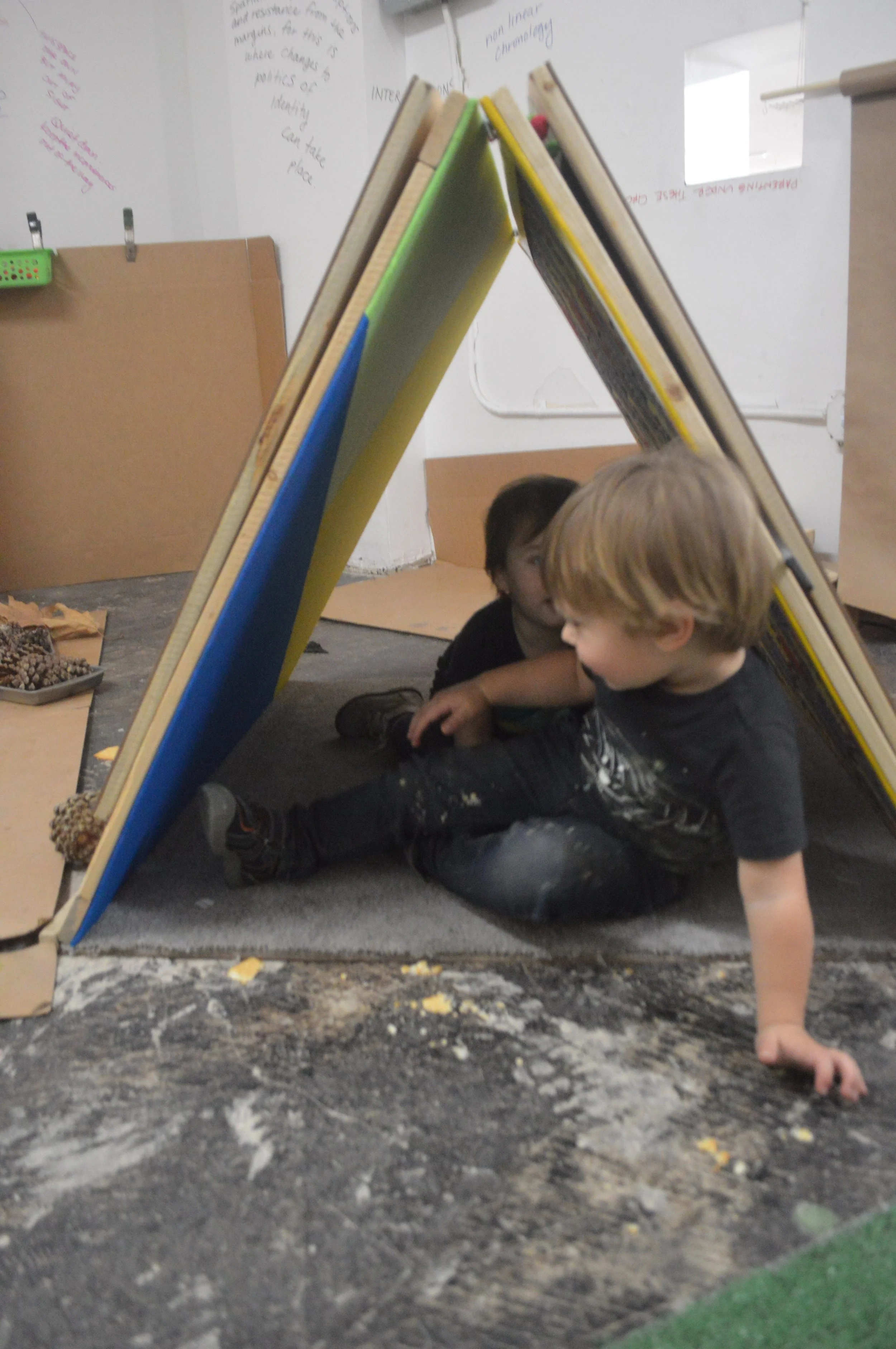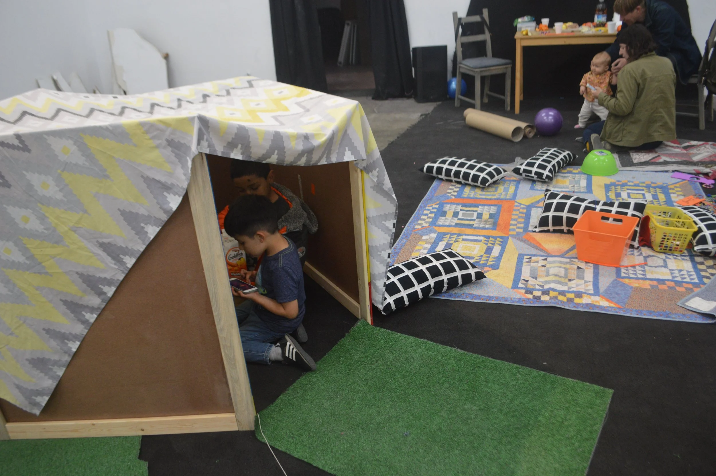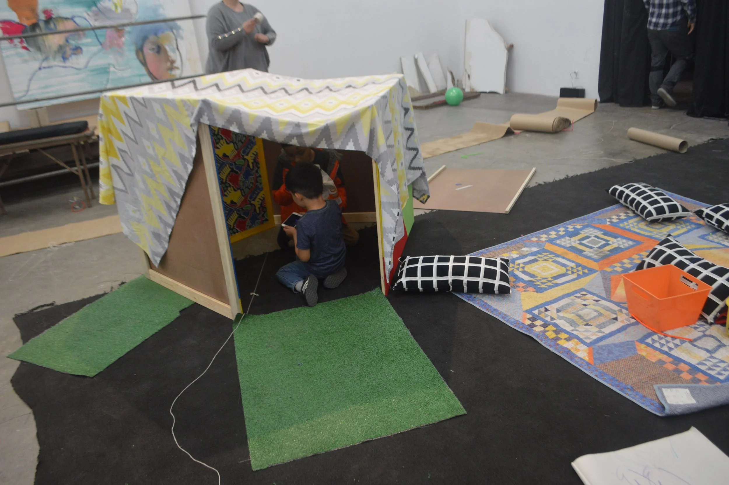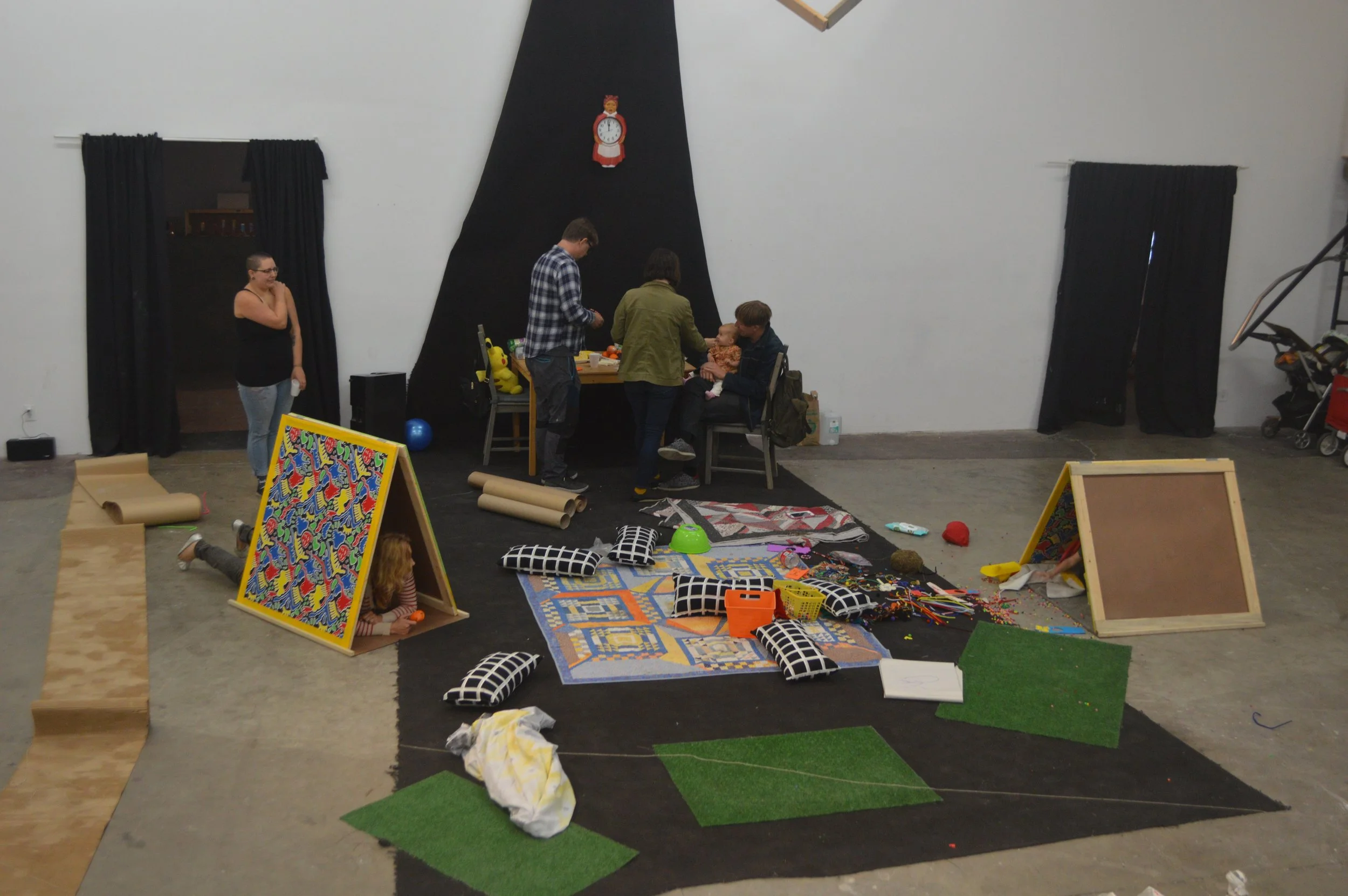 Our co/work/play space was outfitted with art supplies, reading material, free wifi, coffee, tea and (potluck) snacks. Parents that are chest/breastfeeding had a comfortable place to nurse or pump. Babies had a place to nap. Gender neutral bathrooms are available for all. There was a comfortable place to prepare and eat food. Our work space included soft surfaces, costume and hand-building play, and a co-working desk for adults that also serves as a system of tunnels, secret passageways, and dwellings for child-artists to make their work. Through this process our goal was to build a critical vocabulary and radical affirmation that the ways in which we care for one another must be considered a powerful form of culture work and that the cultural material we create can contribute directly to the wellness of relationship within families, networks of communities, and across conflicting or complex identities. We assert that those people that act as primary stewards of relationship: mothers, parents, grandparents, caretakers are in a significant position to build political, social, cultural power. And the combination of this role with the role of “culture worker” is of critical importance and requires support.