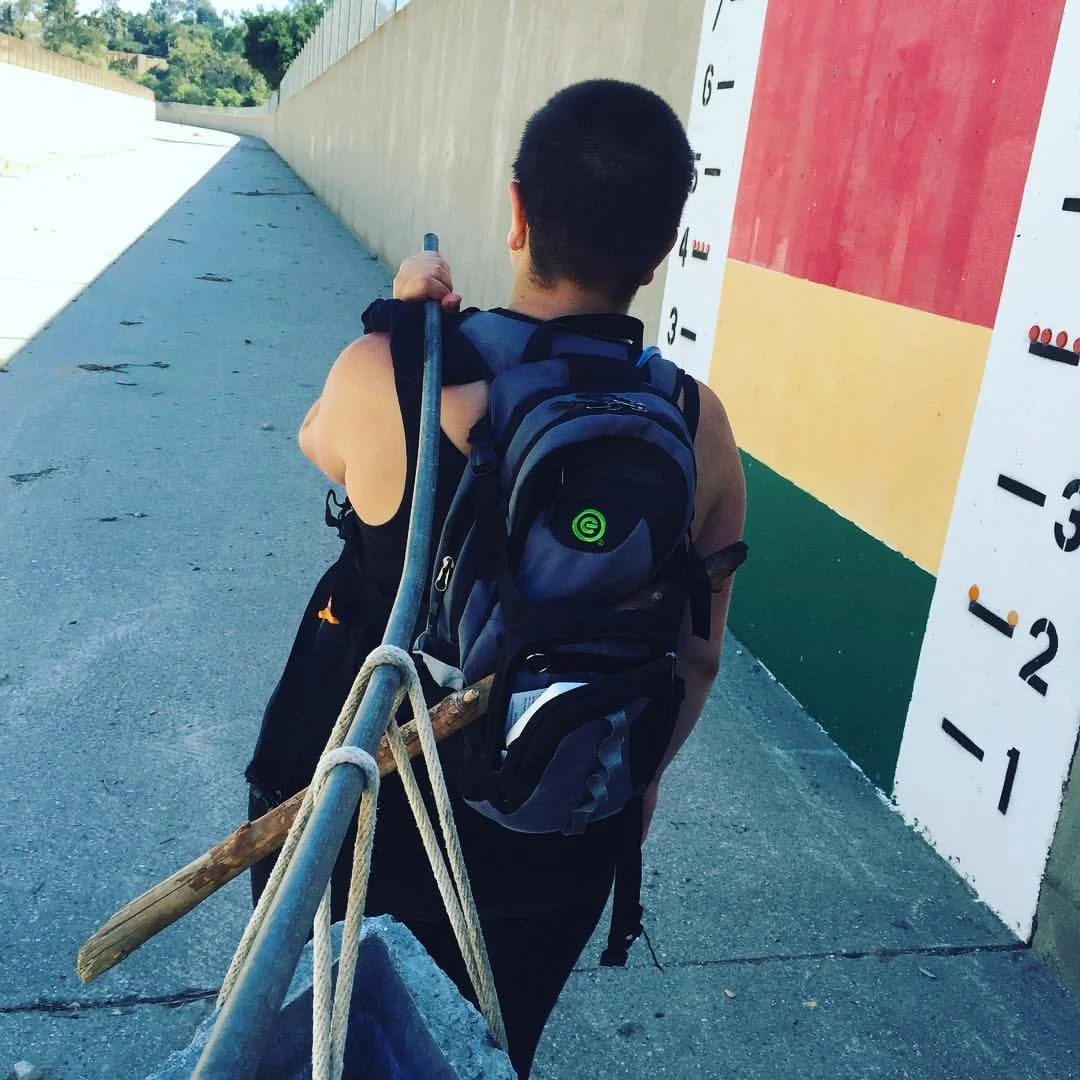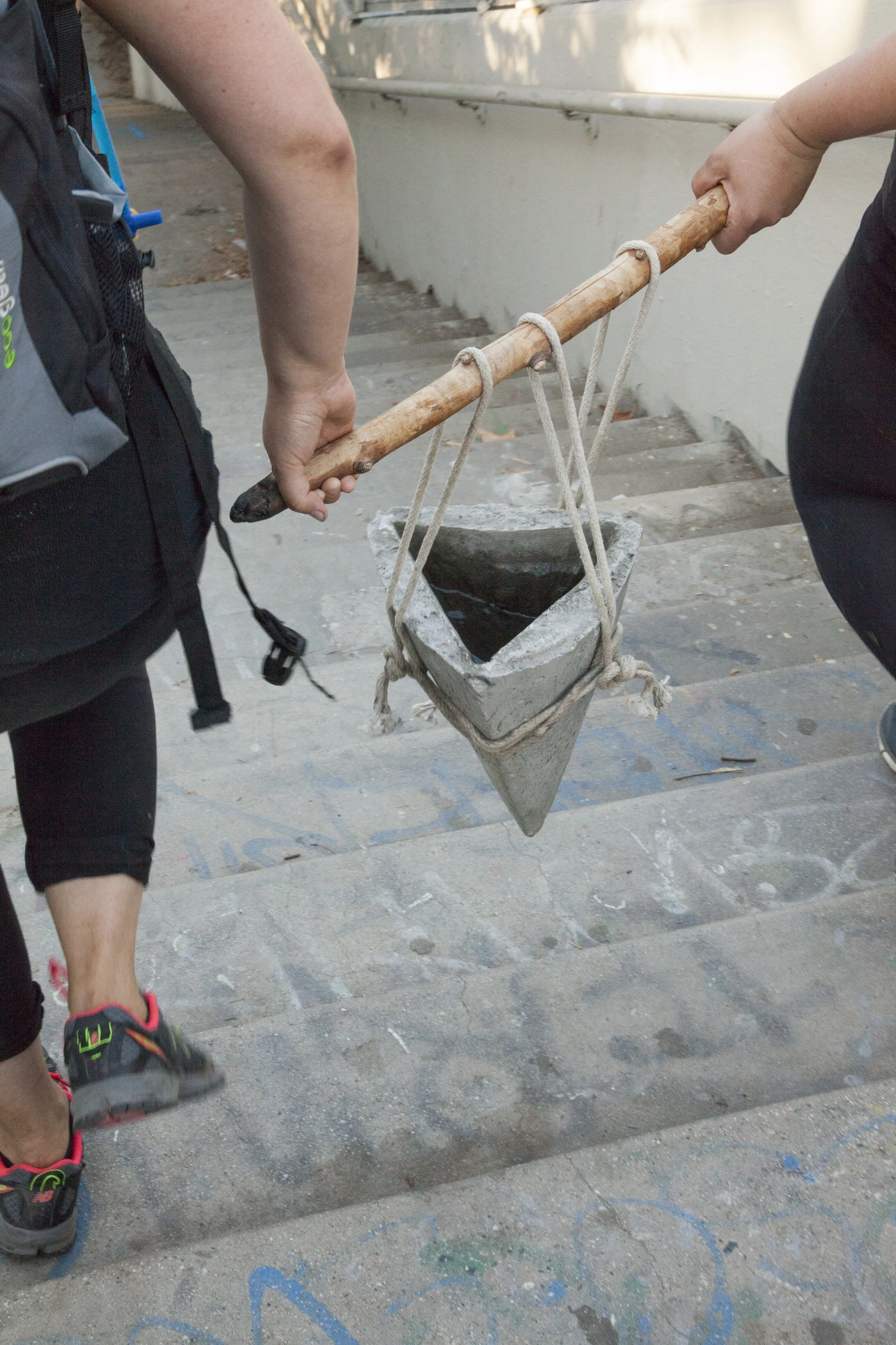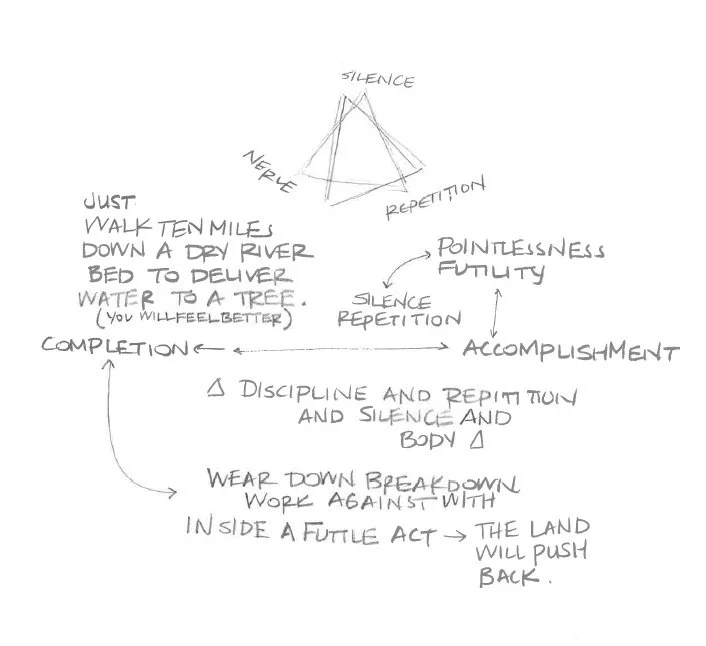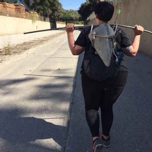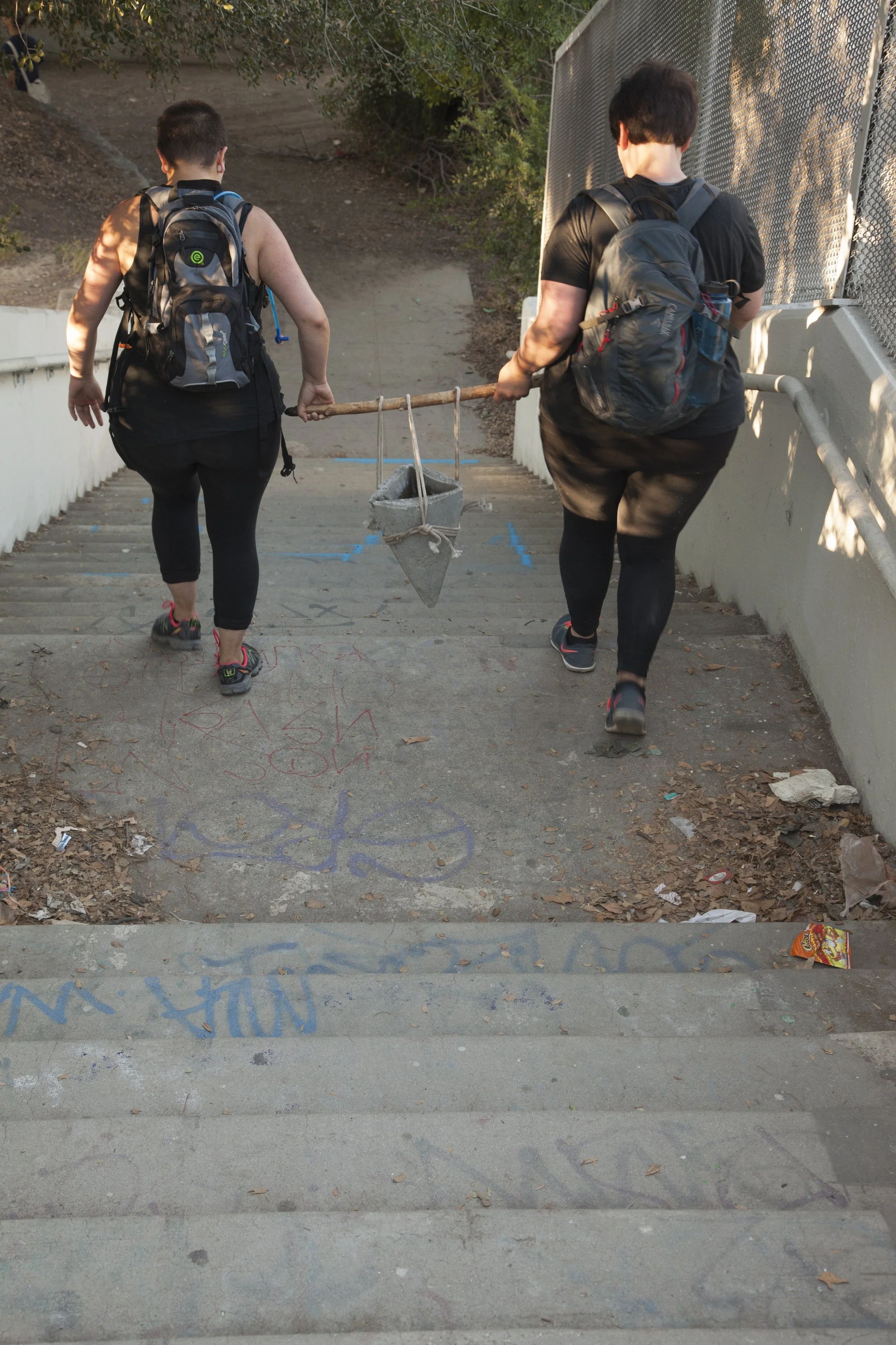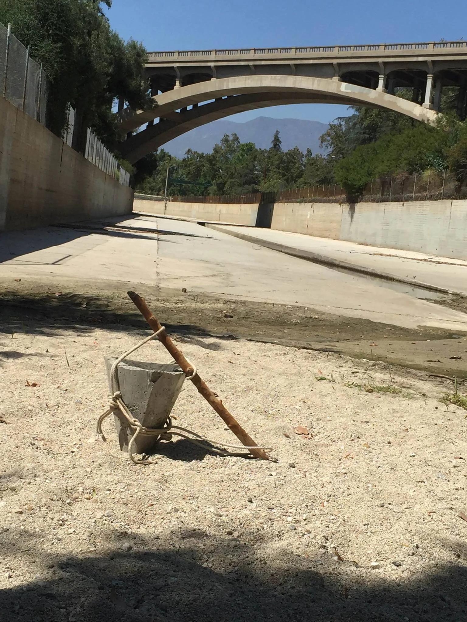 How do we account for the physical and psycho-social distance between land and body that these architectural forms create? In what ways do these forms impact our social memory? Using ritual and ceremony as medium, Hekate sought to draw attention to these questions through a continuous walk along the original riverbed of the Arroyo Seco beginning at its origin site, the Hahamongna Watershed. There they collected water from the North side of Devil’s Gate dam using a handmade concrete vessel and ushered the container to the Sycamore Grove overcrossing on the 110 freeway where they closed the ceremony by clearing a circle at the foot of an oak and offering the water at its root. This ten mile walking ceremony provided a direct experience of the terrain that was once a major natural transit line linking the San Gabriel Mountain range to the Los Angeles River and the documentation of the process was collected in the form of questions directed toward the landscape as they experienced it and images taken at regular intervals from the point of view of the river itself. As the title of this work suggests, a self-defeating contradiction exists in the pursuit to control water. As well within the walking ceremony Hekate simultaneously revered the path the river takes and bore witness to the futility and folly in the attempt to ferry water by hand. As Hekate, we acknowledge the complication and tension created by the nexus of our whiteness and female bodied personhood and hold that intersection with humility, stepping into ceremony as a gesture toward honoring the migration of the water and a method to generate questions that will deepen our collective regard for the this land through the labor of walking.